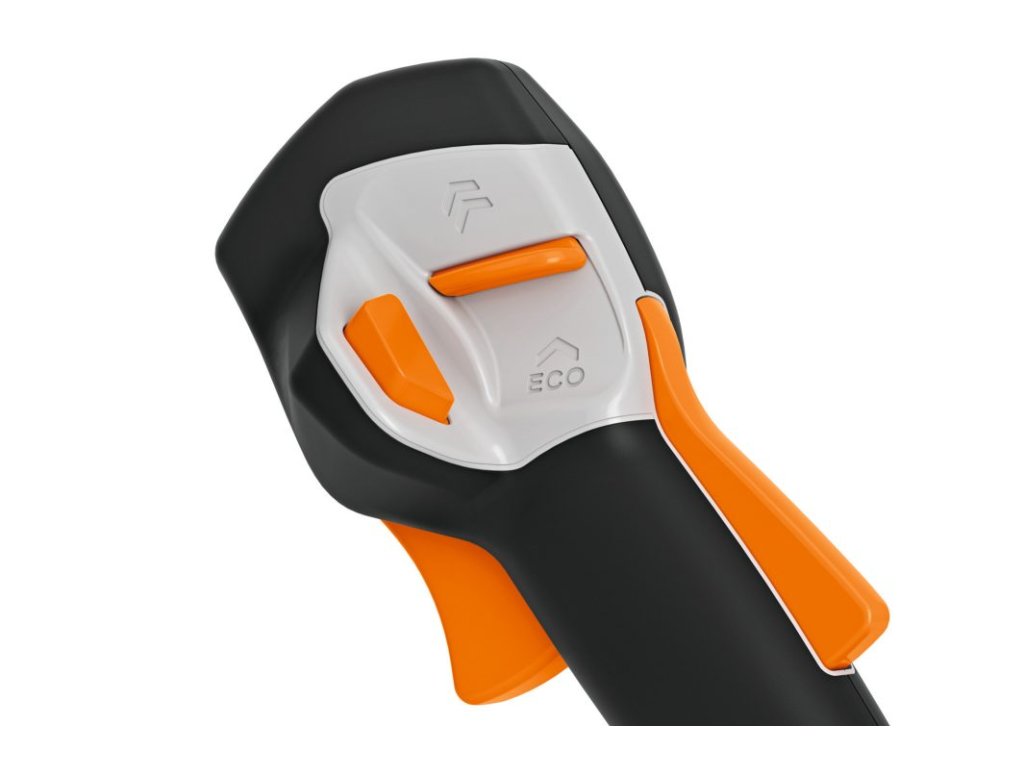EC motor lze v závislosti na použití regulovat pomocí plynulé regulace otáček se 2 stupni přímo na ovládací rukojeti. Pokud chcete pracovat při nižších otáčkách, například při vyžínání okrajů trávníku, zvolte režim ECO (úroveň 1). Tím získáte nižší spotřebu energie a můžete tak prodloužit životnost akumulátoru. Pokud potřebujete plnou rychlost křovinořezu pro sekání křovin a husté trávy, jednoduše přepněte posuvným spínačem na rychlost 2. Rychlost se v každém případě automaticky přizpůsobí připojenému žacímu nástroji a lze ji plynule regulovat.