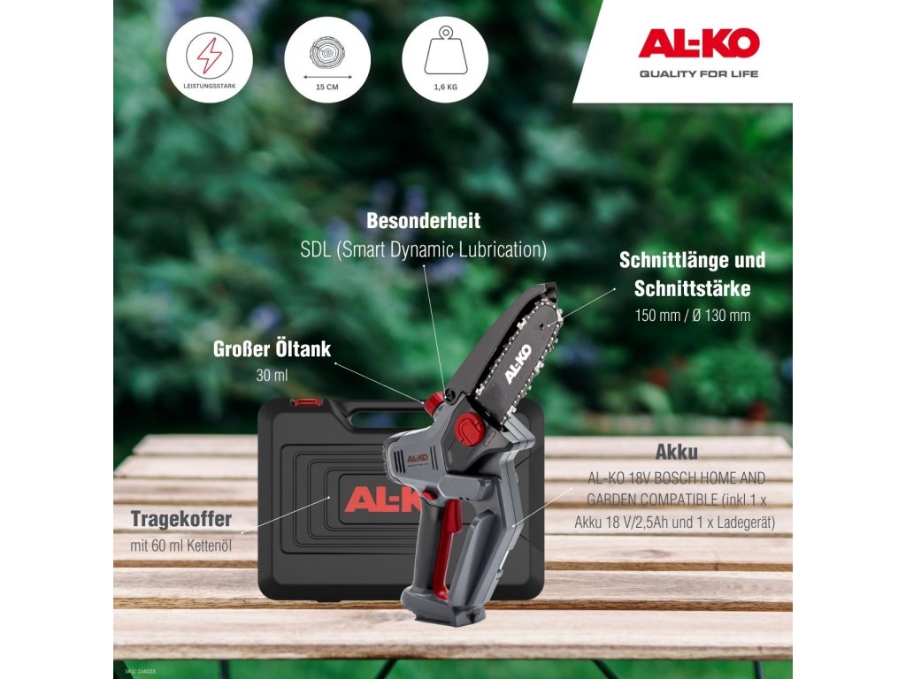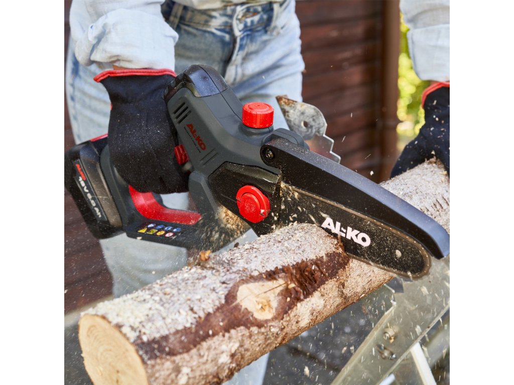 Akumulátorová mini řetězová pila AL-KO CSM 1815 vás dokonale podpoří při řezání a údržbě zahrady. Práce nezávislá na el. síti a bez emisí. Ideální pro prořezávání větví a prořezávání. CSM 1815 je napájena akumulátorem AL-KO 18 V BOSCH Compatible for home and garden. V případě potřeby můžete tento bateriový systém použít k provozu různých zařízení AL-KO s jednou a stejnou baterií – a ušetřit peníze. Pohodlné mazání řetězu podle potřeby Náš vynikající systém SDL - Smart Dynamic Lubrication - maže řetěz pily podle potřeby. Jednoduše zatlačte na primer a řetěz je namazán olejem.