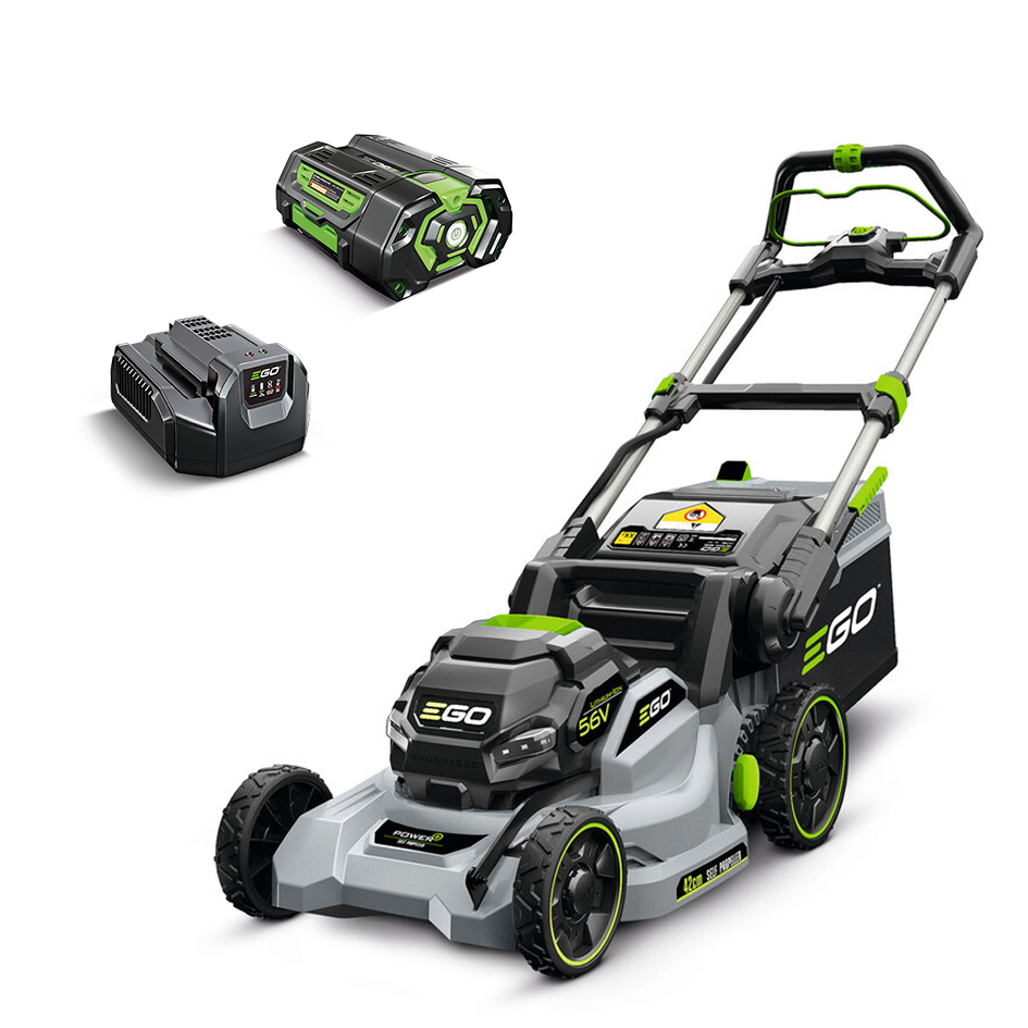 Model EGO LM 1702E-SP - záběr sečení 42cm a plynule proměnlivý pojezd, objem sběrného koše 55L, teleskopická a výškově nastavitelná komfortní rukojeť.