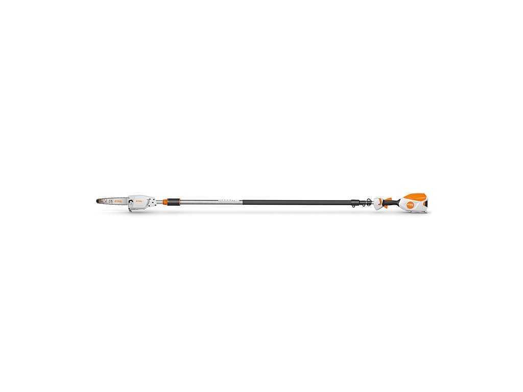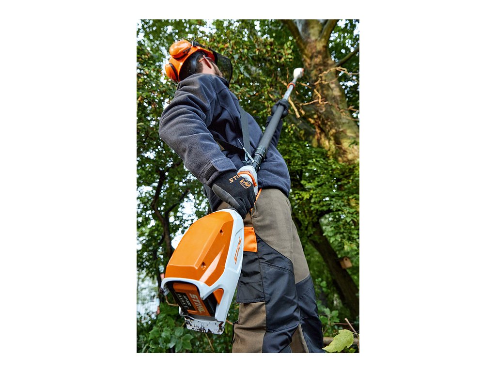Silná akumulátorová vyvětvovací pila.Tichá a s nízkými vibracemi. Pro profesionální uživatele při ošetřování stromů, v ovocnářství a v obcích. K vyvětvování stromů, odstraňování odumřelého dřeva a polámaných stromů a větví po bouřce a také pro řez ovocných stromů. Pilový řetěz ¼“-PM3, lehčí a kompaktnější řezná část s robustním hákem na přidržování větví pro snadné odstranění volného pořezaného materiálu ze stromu. Zvlášť tuhá profesionální teleskopická tyč se systémem rychlého přestavení pro velmi přesné nasazení a přesný řez. Celková délka 270 – 390 cm.