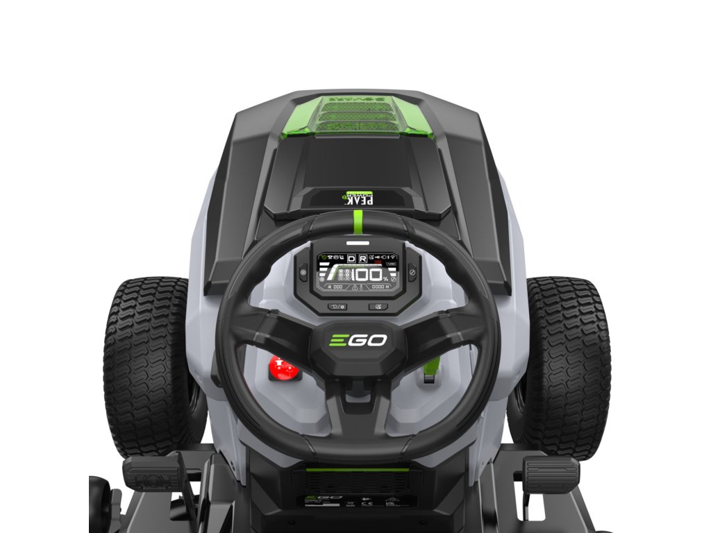 Pod kapotou naleznete bateriové lože pro 6 baterií EGO Power+ 56V ARC. Pro zprovoznění rideru musí být kapacita použitých baterií alespoň 15Ah. Z jakých baterií bude tato kapacita poskládána je na libovůli majitele. V základu je traktor opatřen dvěma bateriemi s kapacitou 10 + 5Ah, která dokáže napájet traktor pro zdolání travnaté plochy až cca 800 m2, samozřejmě v závislosti na podmínkách. Do bateriového lože můžete potom vložit libovolný počet baterií v závislosti na požadovaném plošném výkonu traktoru. Max. kapacita je 6x12Ah, což je zásoba energie na posekání cca 10.000 m2. Rovnoměrný odběr z baterií a nabíjení, nehledě na jejich velikost, neustále hlídá a reguluje patentovaná technologie EGO, nazvaná Peak Power™. Jakoukoliv baterii, kterou máte v rideru můžete kdykoliv vyjmout a použít pro napájení jakéhokoliv dalšího stroje z nabídky EGO. Přes Bluetooth rozhraní je možnost připojení na dálku pomocí EGO Connect aplikace, což umožňuje uživateli nejenom sledovat výkon stroje ale také hlídat aktuální stav baterií tak, aby byla včas připraveny k práci.