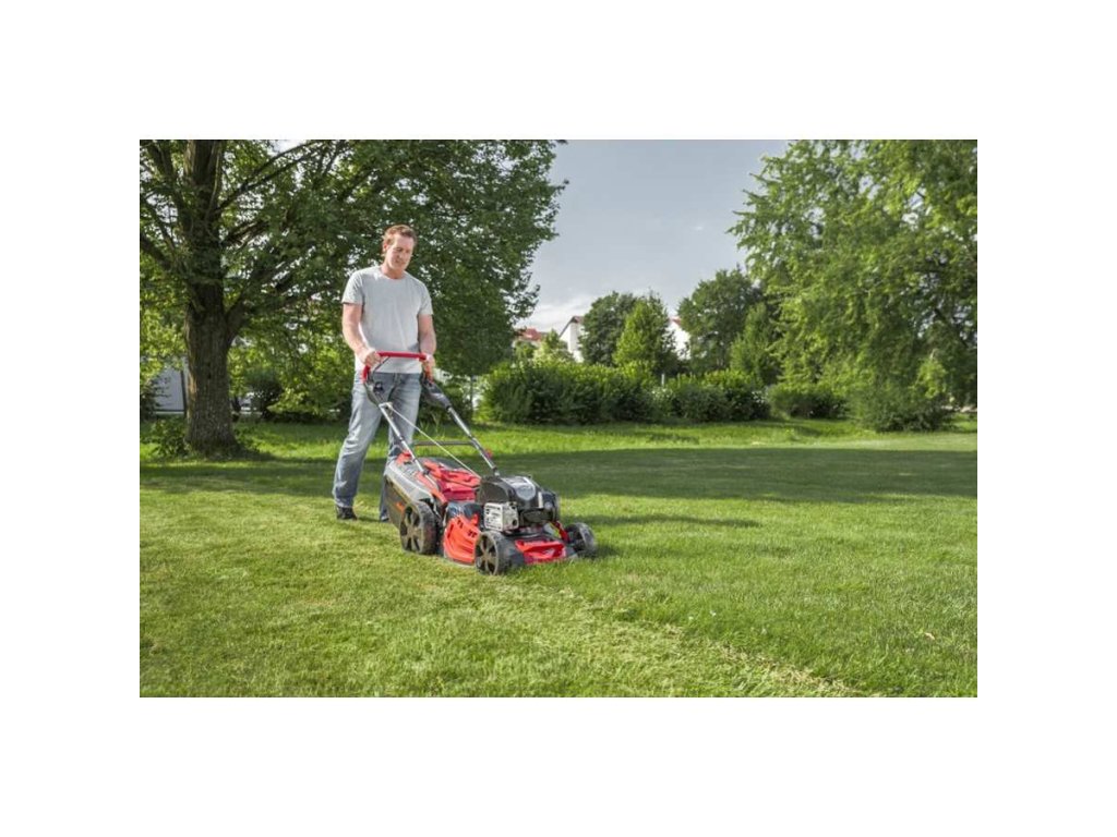 Benzínová sekačka na trávu s pracovní šířkou 51 cm umožňuje efektivní sečení travních ploch až do velikosti 1800 metrů čtverečních. Výšku sečení lze nastavit centrálně v 7 krocích od 30 mm do 80 mm pro dokonalé přizpůsobení vašim požadavkům. Díky benzínovému motoru Briggs & Stratton s výkonem 2,6 kW a pohonem kol s plynulou regulací (od 2,5 do 4,5 km/h), je sečení zahrady i ve svahu velmi snadné. Díky funkci 4INONE lze trávník posekat a dokonale dopravit do sběrného koše o velikosti 70 l, který disponuje ukazatelem stavu naplnění. Další výhodou je možnost mulčování a funkce bočního výhozu. Mimořádně vysoké šasí a skvělá aerodynamika sekačky s technologií MaxAirflow zaručuje úplné naplnění koše, což v důsledku znamená, že koš nemusíte vyprazdňovat tak často, jako je tomu u konkurenčních sekaček. Optimální easyDrive kokpit se snadno přístupnými ovládacími prvky a příjemným polstrováním rukojeti ještě více zpříjemňuje práci při sekání velkých travních ploch. Integrované transportní držadlo je ideální při přepravě sekačky, nebo přenášení sekačky přes překážky. Funkce servisní polohy umožňuje snadný přístup při čištění sekačky a šetří místo při jejím skladování.