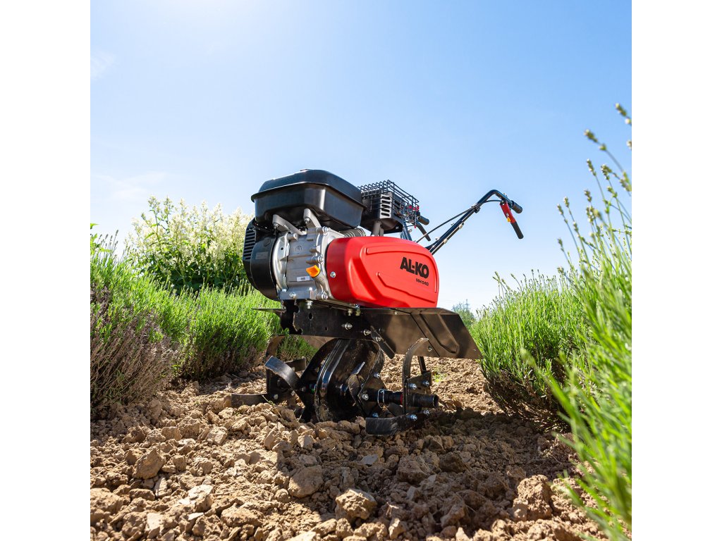 Aktivně pracující, speciálně tvarované čtyři sady nožů jsou poháněny silným motorem o výkonu 3,45 kW. To znamená, že zařízení o hmotnosti 51 kg má potřebnou tažnou sílu. Pomocí 3-stupňové nastavitelné brzdové ostruhy můžete upravit pracovní hloubku podle potřeby. S pohonem vpřed a vzad.