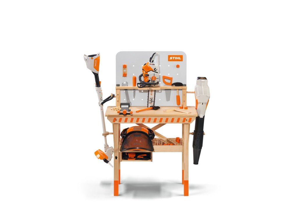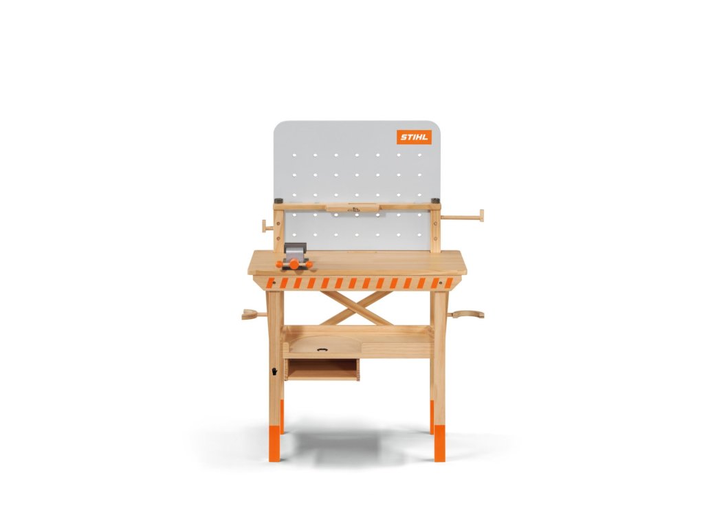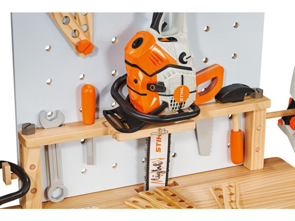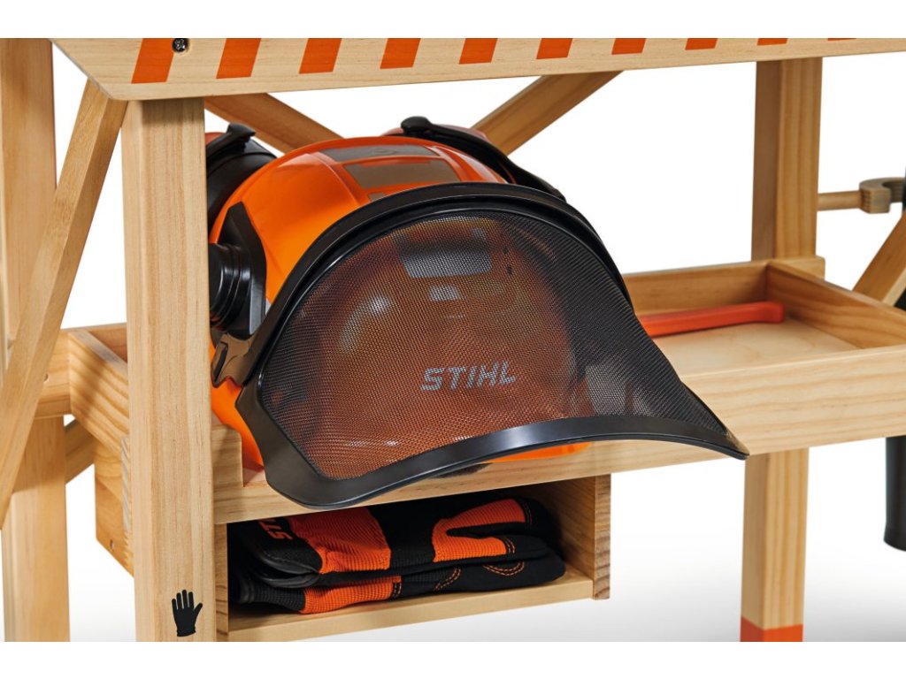 Stůl pro každého malého kutila. Pracovní stůl je vyroben ze dřeva a je vybaven držáky na celou řadu dětského nářadí STIHL: vejde se na něj motorová pila, foukač, křovinořez, helma i rukavice. Pracovní stůl s certifikátem FSC nabízí také dostatečný pracovní prostor pro největší projekty vašeho dítěte.