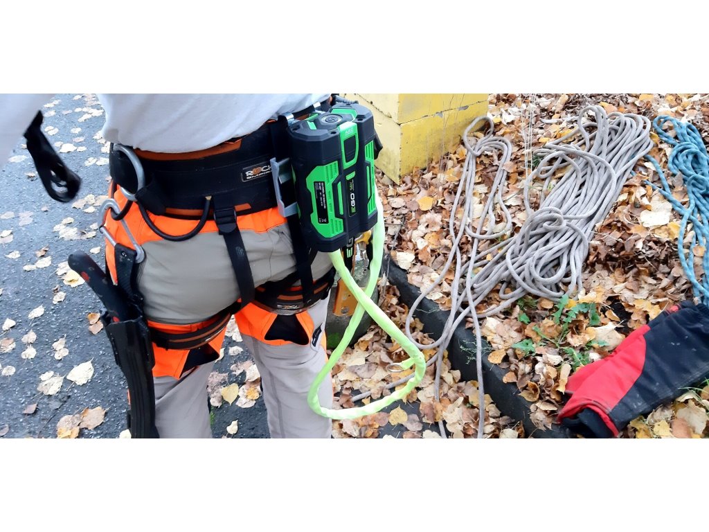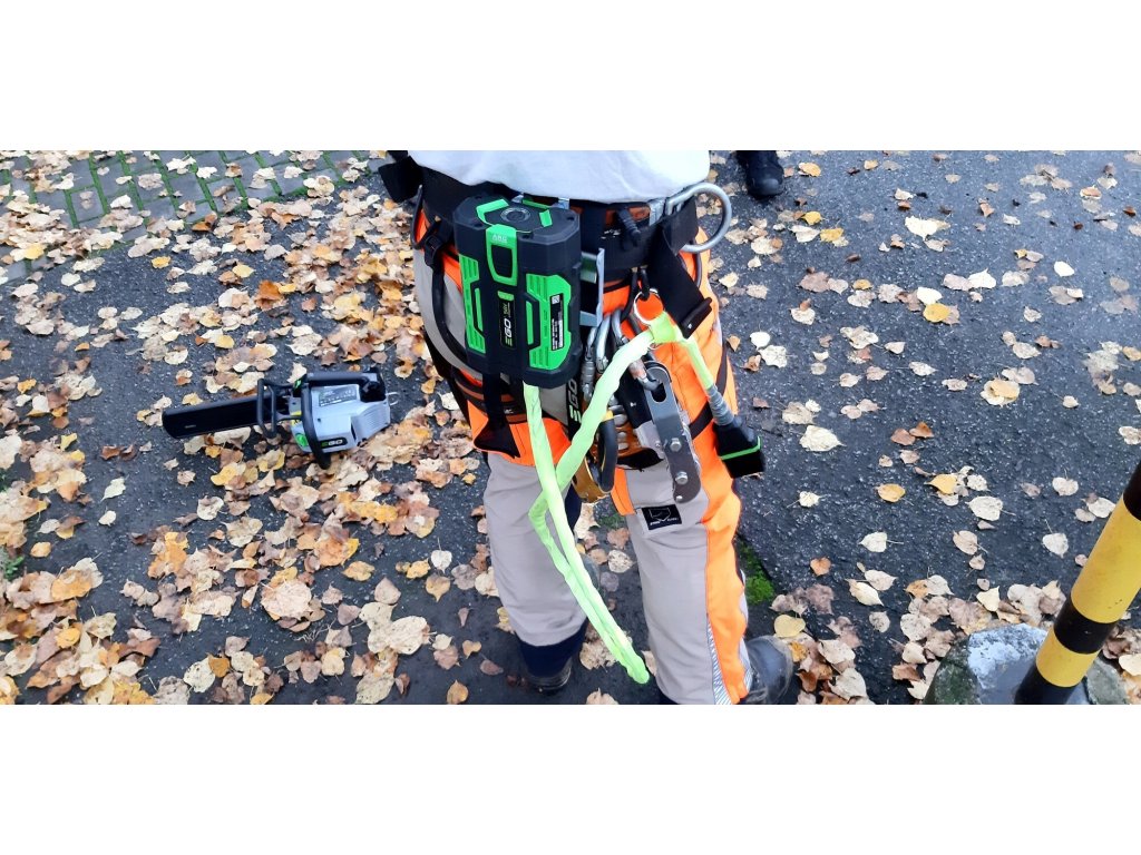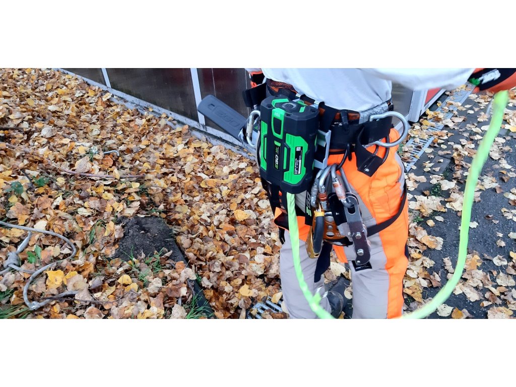 Je všeobecně známo, že čím větší baterie, tím větší výkon, delší pracovní doba, ale bohužel i větší hmotnost baterie. Na druhou stranu zase čím lehčí je stroj, tím komfortnější a snadnější je jeho obsluha. Např. baterie s kapacitou 5,0 Ah váží 2,2kg a např. baterie s dvojnásobnou kapacitou 10,0Ah váží již 3,4kg. To je hmotnost, která při dlouhodobější práci stojí za to převést z rukou na záda. Proto existuje pohodlnější způsob maximálního využití energie bez zbytečného zatěžování rukou. Díky ergonomickému profesionálnímu opaskovému nosiči baterií přemístíme hmotnost baterie na bedra uživatele a stroj se stává podstatně lehčím a ovladatelnějším. Nosič je opatřen kompaktním lože na baterii a závěsem na opasek uživatele. Proti vysunutí nosiče z opasku slouží pojistné řemínky. Pro případ možnosti napájení strojů z kategorie EGO Power+ a EGO Pwer+ Professional je nutné dokoupit adaptér ADB1000.