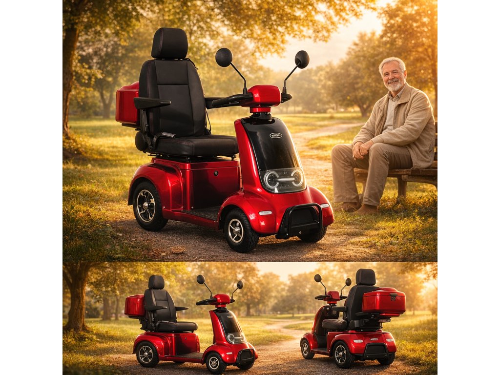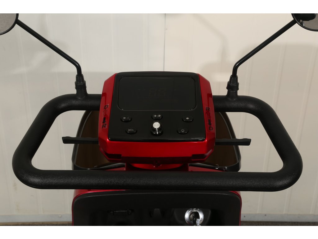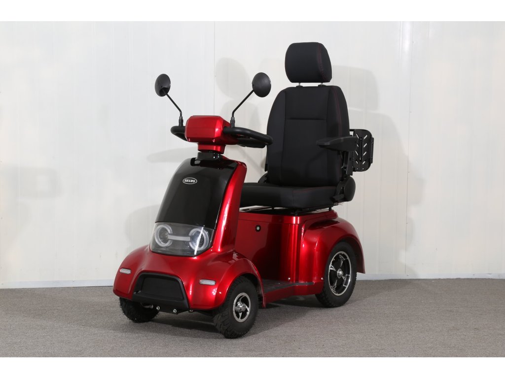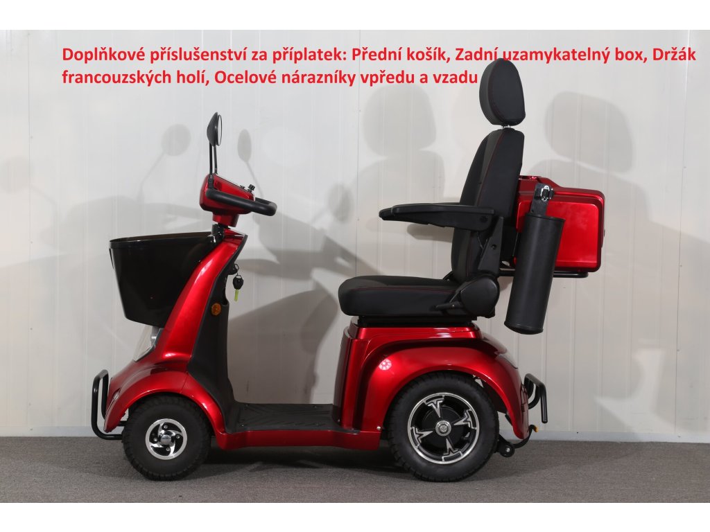Tento invalidní elektrovozík je uzpůsoben pro potřeby osob se zhoršeným zdravotním stavem. Pomocí páček na řidítkách velmi jednoduše volíte rychlost pojezdu, dále máte možnost max. rychlost omezit kolečkem (potenciometrem). Tento model umožňuje dokoupení řady různého příslušenství jako je přední košík, zadní box nebo zadní skládací koš. K dispozici jsou také ocelové nárazníky, které velmi doporučujeme k ochraně plastů. Případně se může hodit také držák francouzských holí a krycí plachta. Polohovatelné sedadlo tvoří pohodlnou oporu celých zad. Loketní opěrky po obou stranách pomáhají ještě vyššímu komfortu.