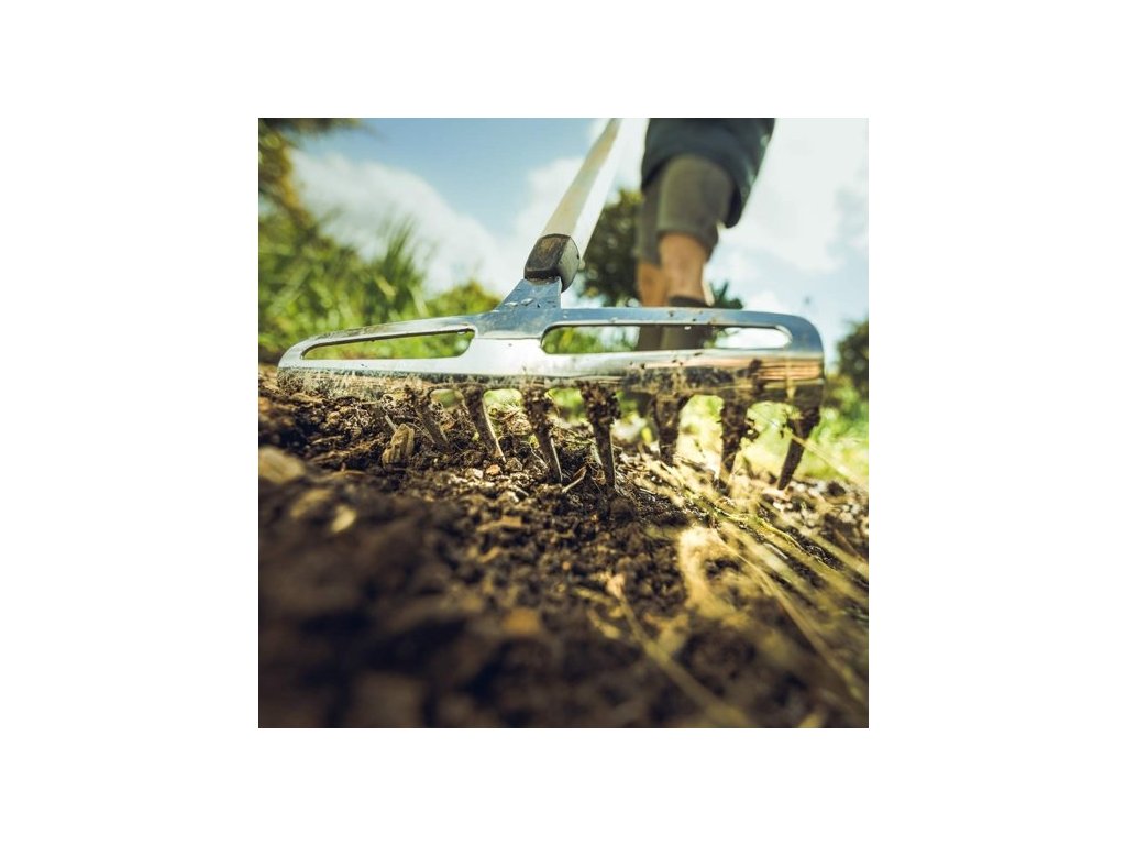 - Ideální pro přípravu záhonů, zarovnávání půdy i pro rozprostírání mulčovací kůry.