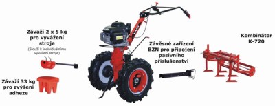 Kombinátor K-720 se skládá z hlavního rámu, ke kterému se pomocí třmenů zajištěných šrouby připojuje pět nastavitelných radliček. Prutový válec je zasazen čepy v kluzných ložiscích a je zajištěn třmenovými kroužky. Kombinátor se připojuje přímo do závěsného zařízení BZN, k vymezení vůle (6-8 mm) slouží dvojice šroubů s maticemi. Šíře záběru K-720 je max. 72 cm, hmotnost 30 kg a prac. hloubka max. 5 cm.