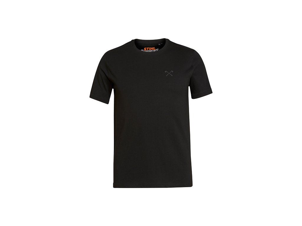 STIHL TIMBERSPORTS®: tonální, mírně vyvýšený potisk se zkříženými sekerami ve výši prsou.