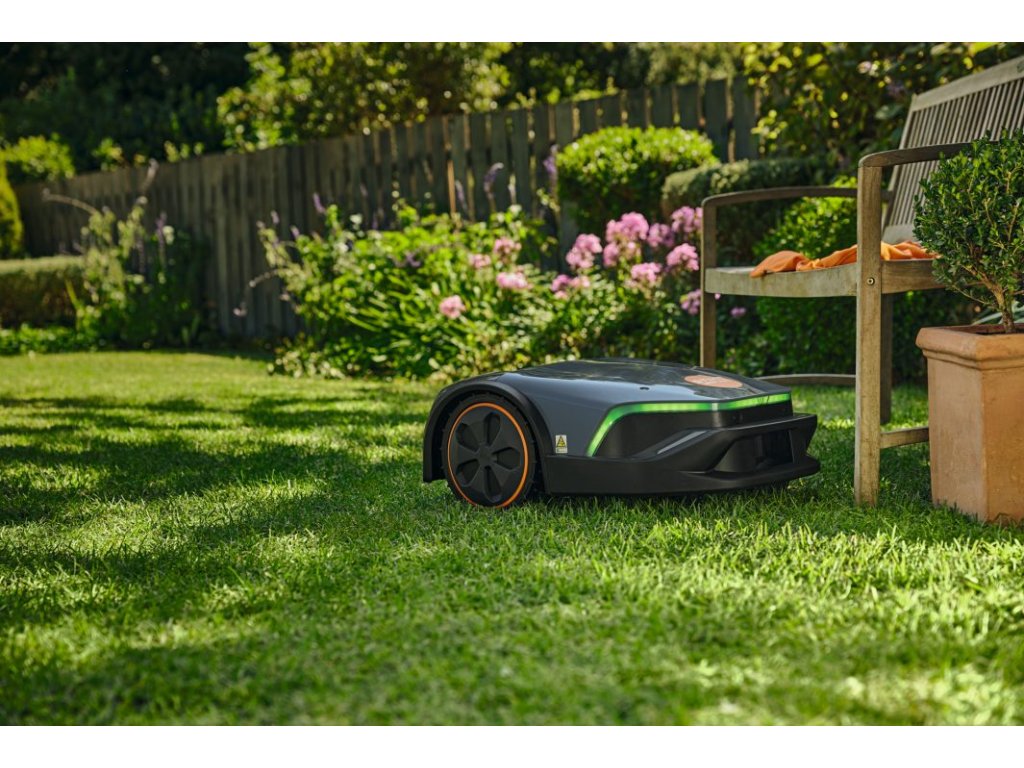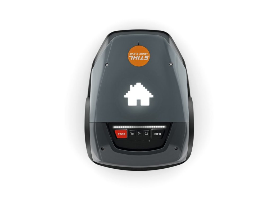 Ovládací panel umožňuje snadné ovládání pomocí několika tlačítek. Intuitivní ovládání je navíc podpořeno funkcí hlasového výstupu. Aktuální stav je zobrazován prostřednictvím zadního LED pásu a pomocí maticového světelného vzoru LED na horní straně. Přední LED pásek nabízí denní svícení ve 3 různých režimech. Robotickou sekačku iMOW® 5 Evo můžete kdykoli ovládat prostřednictvím Bluetooth®, Wi-Fi nebo, pokud se robotická sekačka nachází mimo domov, prostřednictvím mobilní komunikace pomocí aplikace MY iMOW®. Mimo oblast domova lze modul mobilní komunikace použít také k vysledování krádeží pomocí alarmu a k určení polohy vaší sekačky. Pomocí aplikace můžete také nastavit výšku sečení na různé individuální úrovně a pomocí plánu sečení lze určit týdenní naplánované časové úseky, během nichž může být vaše sekačka automaticky aktivní. V případě potřeby můžete robotickou sekačku spustit také ručně. Pomocí dešťového senzoru lze také určit, zda má sekačka za deště pokračovat v sečení, nebo zda má sečení přerušit. Jako základnu a pro nabíjení používá robotická sekačka svou dokovací stanici.