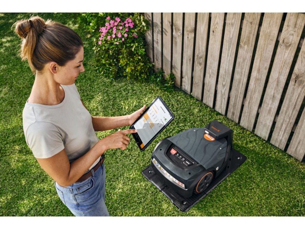 Ovládací panel má jen několik tlačítek pro jednoduché ovládání. Intuitivní ovládání podporuje také funkce hlasového výstupu. O aktuálním stavu robotické sekačky informuje zadní LED pásek a maticový světelný vzor LED na horní straně krytu. U světel na předním LED pásu si můžete vybrat ze 3 různých režimů. Sekačku STIHL iMOW® 7 EVO můžete kdykoli ovládat pomocí aplikace MY iMOW®, a to jak přes Bluetooth® nebo Wi-Fi, tak i prostřednictvím mobilní sítě. Mimo domovský prostor lze pomocí aplikace aktivovat také funkci alarmu pro zjištění krádeže nebo určení polohy vaší robotické sekačky. Pomocí aplikace můžete navíc nastavit výšku sečení na různé individuální úrovně. Plán sečení lze použít k zadání týdenních plánovaných časových úseků, během nichž se vaše sekačka STIHL iMOW® 7 EVO může automaticky aktivovat. V případě potřeby můžete robotickou sekačku spustit také ručně. Dešťový senzor můžete individuálně nastavit tak, aby sečení pokračovalo i za deštivého počasí, nebo aby sekačka během deště sečení pozastavila.