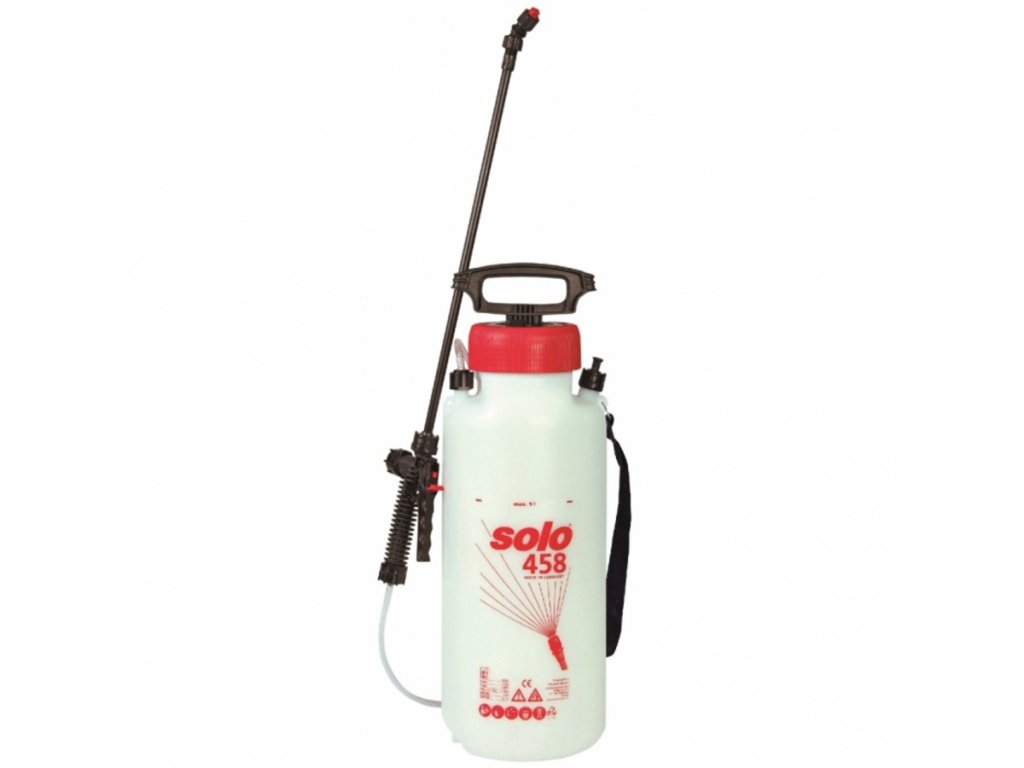 Profesionální tlakový postřikovač SOLO 458 s nádrží na postřik o objemu 11 litrů. Je vhodný pro ošetřování rostlin a různé dezinfekční práce. Je vyrobený z pevných plastů odolných proti UV záření. Postřiková kapalina se v nádrži tlakuje pístovým čerpadlem. Při práci se postřikovač nese v ruce - tlakovací páka je zachycená ve víku - nebo na popruhu přes rameno. Popruh je součástí dodávky. Spuštění postřiku se ovládá ventilem v rukojeti. Spouštěcí páka je vybavená aretací pro trvalý provoz. Široký nalévací otvor usnadňuje nalévání postřiku, ale i čištění postřikovače po použití. Součástí dodávky je štěrbinová tryska pro plošný postřik a tryska pro kruhový postřik (dutý kužel).