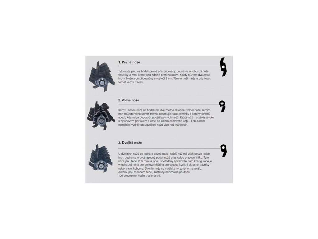 U dvojitých nožů se jedná o pevné nože, každý nůž má však pouze jeden hrot. Jedná se o dvojnásobný počet nožů přes celou pracovní šířku. Tyto nože jsou tenčí (1,5 mm) a jsou uspořádány spirálovitě. Tato konfigurace je vhodná zejména pro golfová hřiště a pro vysoce kvalitní okrasné trávníky nebo travní koberce. Dvojité nože se vyrábí z tvrzeného materiálu. Ačkoliv jsou mnohem tenčí, zůstávají minimálně po dobu 100 provozních hodin trvale ostré.