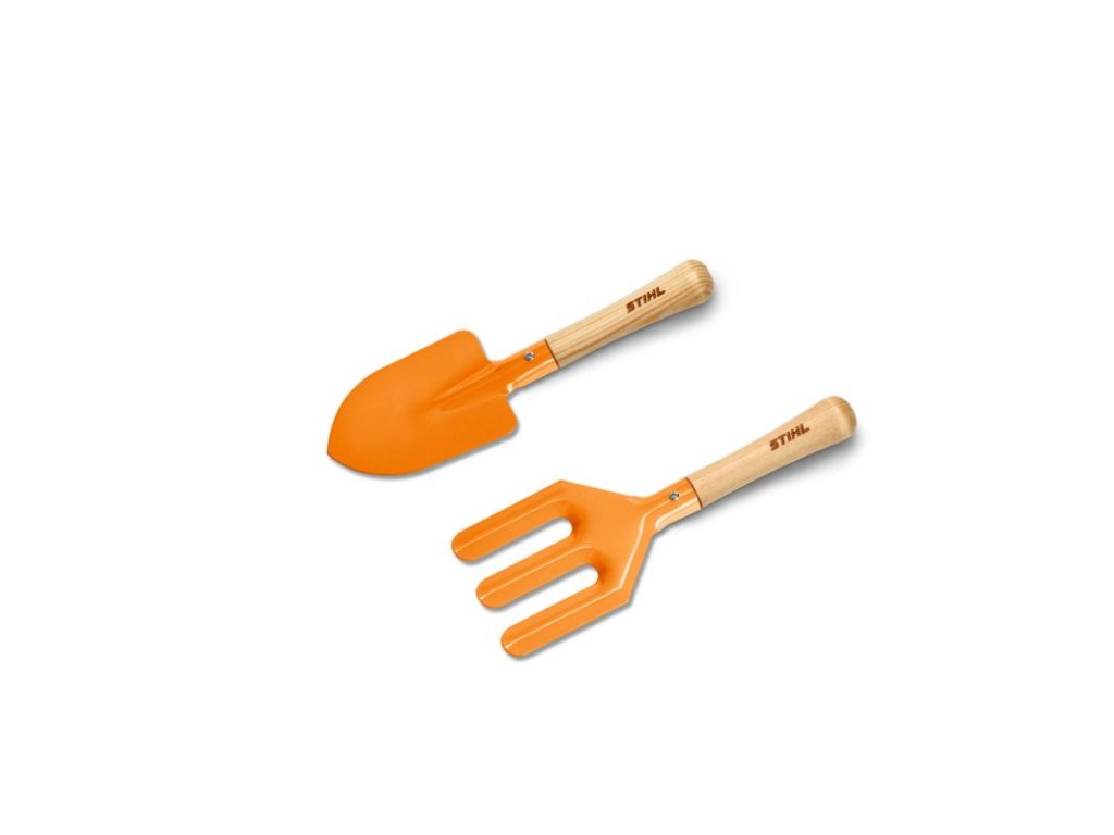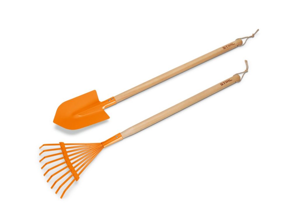 Pro budoucí zahradníky: s touto sadou vysoce kvalitního zahradního nářadí pro děti STIHL mohou malí zahradníci pracovat společně s dospělými. Sada obsahuje velkou lopatu a hrábě na listí spolu s menší lopatkou a hráběmi. Všechny produkty jsou vyrobeny z borovicového dřeva s certifikátem FSC, lakované a potažené kovem. Dřevěné násady zdobí potisk s logem STIHL.