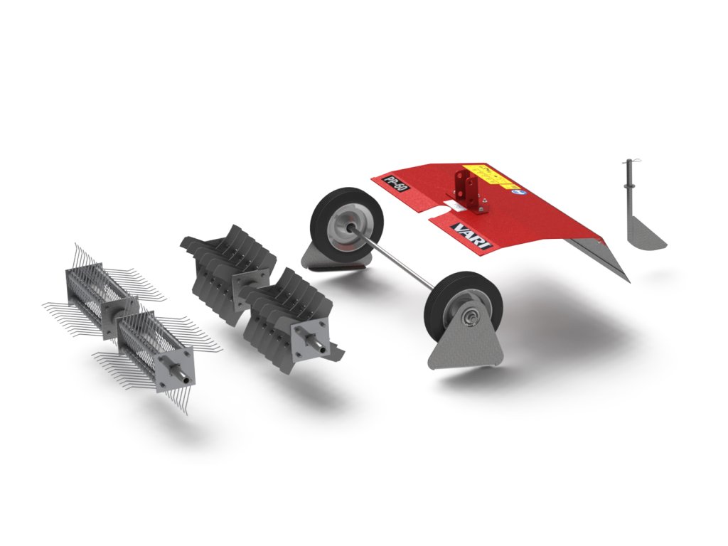 VARI zůstává věrno svému názvu a tak si nemusíte kupovat celý stroj PP-60, pokud již vlastníte rotační plečku, ale pouze sadu dílů pro přestavbu. Z Vaší plečky jednoduše odmontujete okopávací nože a jejich bezpečnostní kryt a pomocí přestavbového setu, který obsahuje dvě unášecí klece s osovým čepem, sadu vyčesávacích pružin, sadu vertikutačních nožů, boční vodicí kola, sklopné startovací opěry, bezpečnostní kryt a zadní brzdicí ostruhu, ji snadno přestavíte na provzdušňovač/prořezávač trávníků. Ostatní díly - převodovku, přední vodicí kolo, držák radličky a zajišťovací kolíky - použijete ze své rotační plečky.