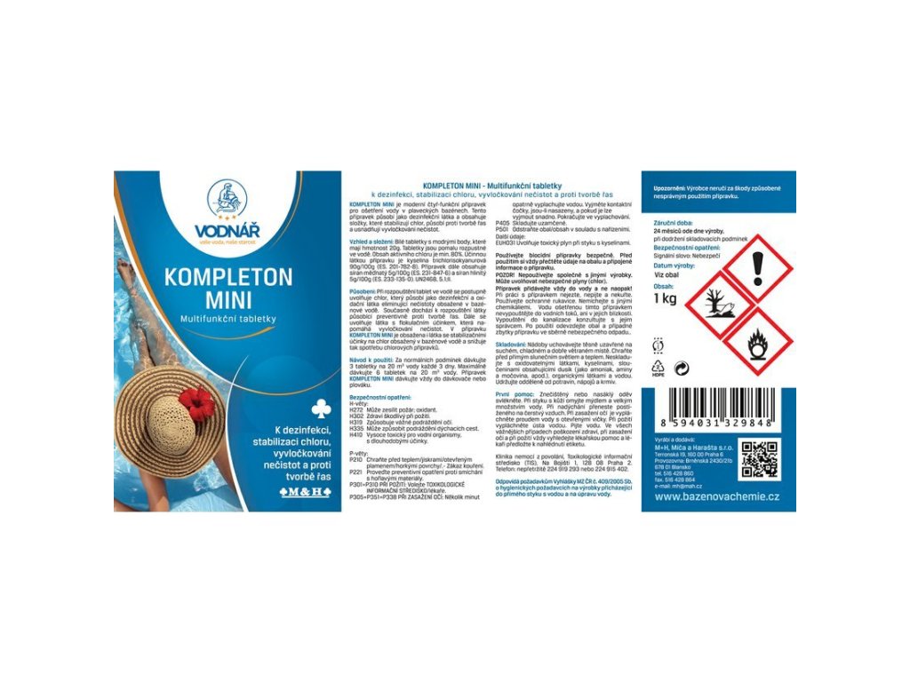 Kompleton mini je 4-funkční dezinfekce pro kompletní péči o malé bazény ve formě 20g tabletek. Obsahuje složky pro dezinfekci, stabilizaci chloru, vločkování a proti tvorbě řas.
