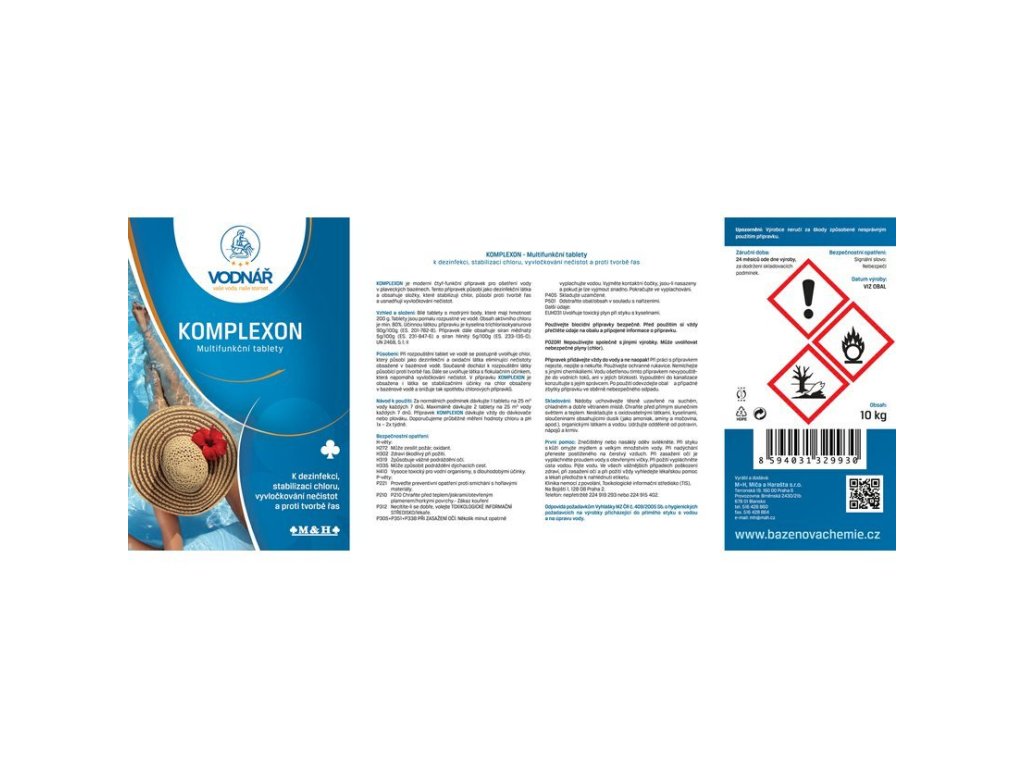 Komplexon je moderní čtyřfunkční přípravek pro ošetření vody. Tento přípravek působí jako dezinfekční látka a obsahuje složky, které stabilizují chlor, působí proti tvorbě řas a usnadňují vyvločkování nečistot. Obsah aktivního chloru je 80%.