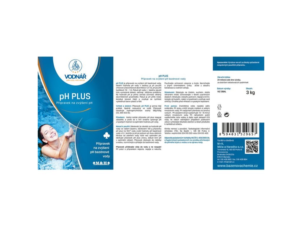 Vodnář pH plus je přípravek na zvýšení pH bazénové vody ve formě prášku. Ideální hodnota pH v bazénu je při použití chlorové dezinfekce 7,2-7,6. Při používání kyslíkové chemie je ideální oblast pH v rozsahu 7,0-7,4. Pokud pH vody opustí tyto vymezené oblasti, mohou začít problémy.