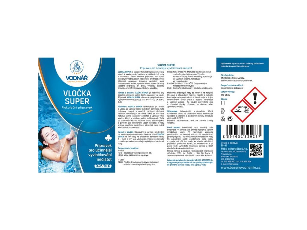 Vločka super je kapalný flokulační přípravek, který slouží k vyvločkování nečistot a udržení čiré vody v bazénech. Je vysoce účinný, lépe filtruje vločky, stabilizuje vodu a pH vody, tím dochází ke snížení spotřeby přípravků na úpravu vody.