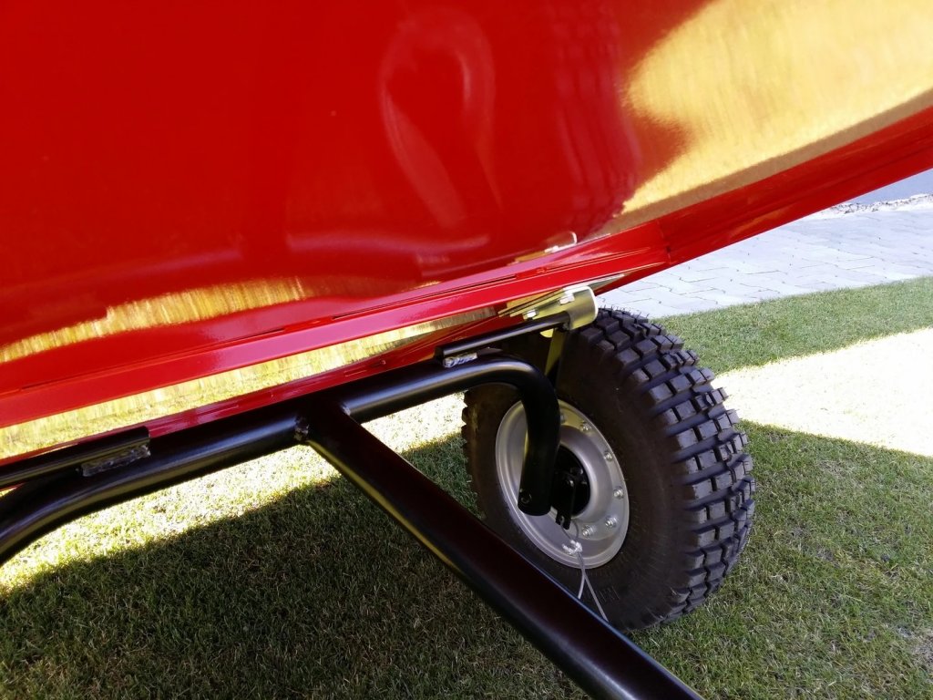 Terénní dezén pneumatik, sklápěcí korba (ručně), kola 145 x 70 - 8 na ložiskách, nosnost 300 kg.