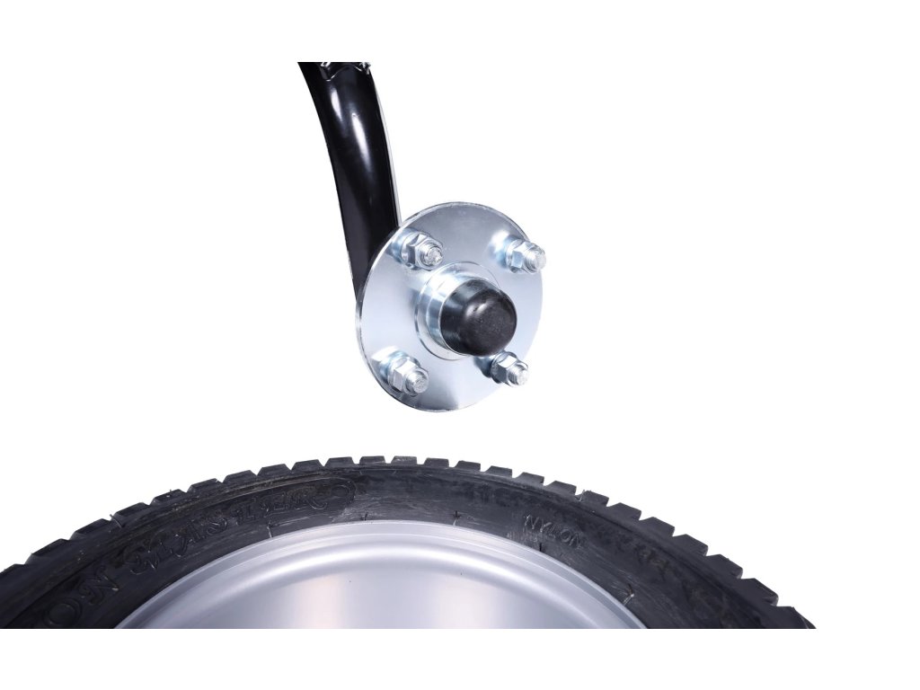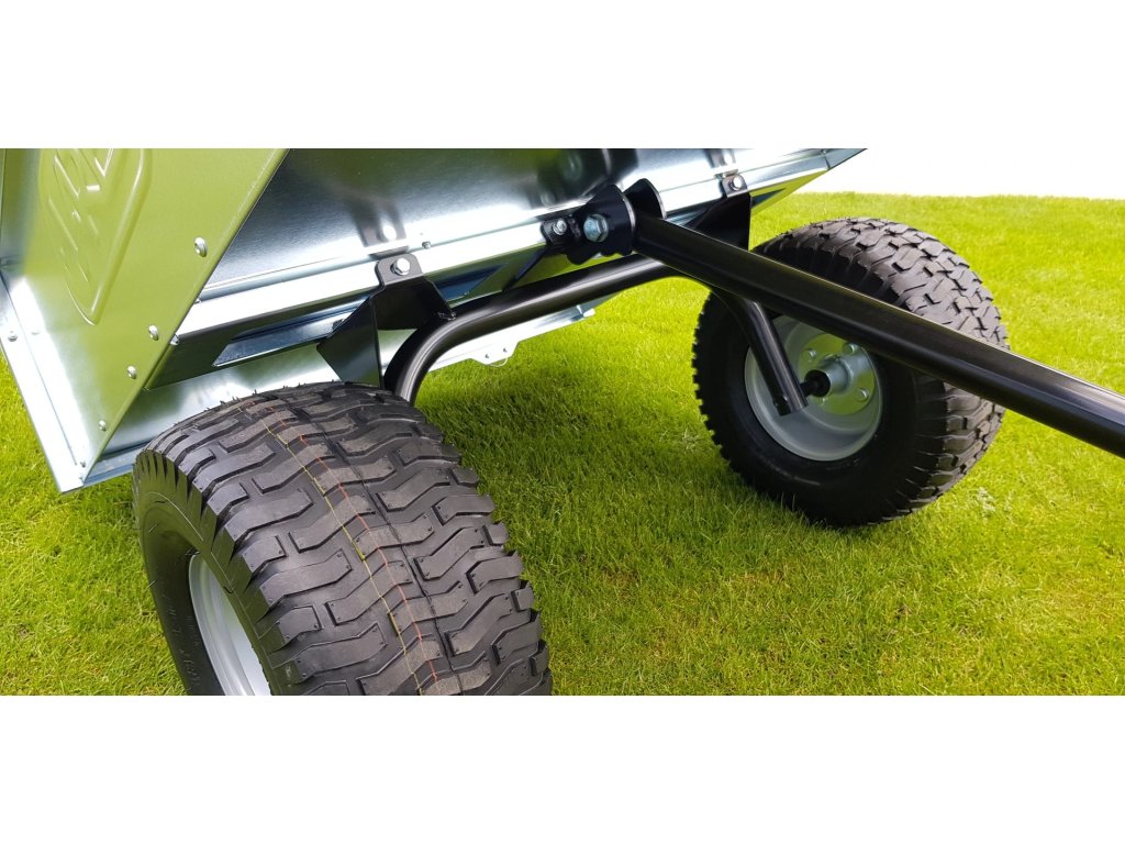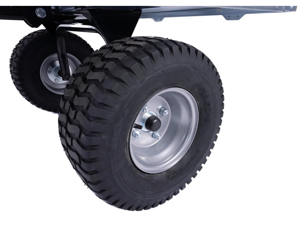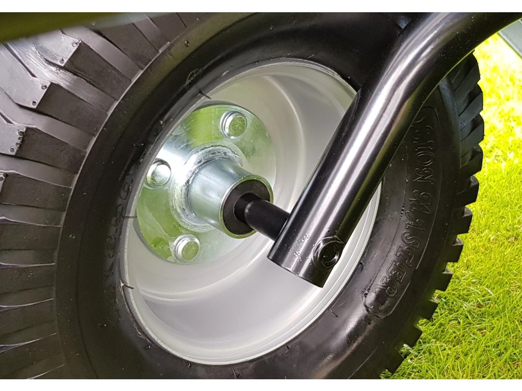 Vozík je dodáván se sestavenou nápravou, jednoduchá a rychlá montáž kol na 4 šrouby. Dezén pneumatik je velmi šetrný k trávníku.